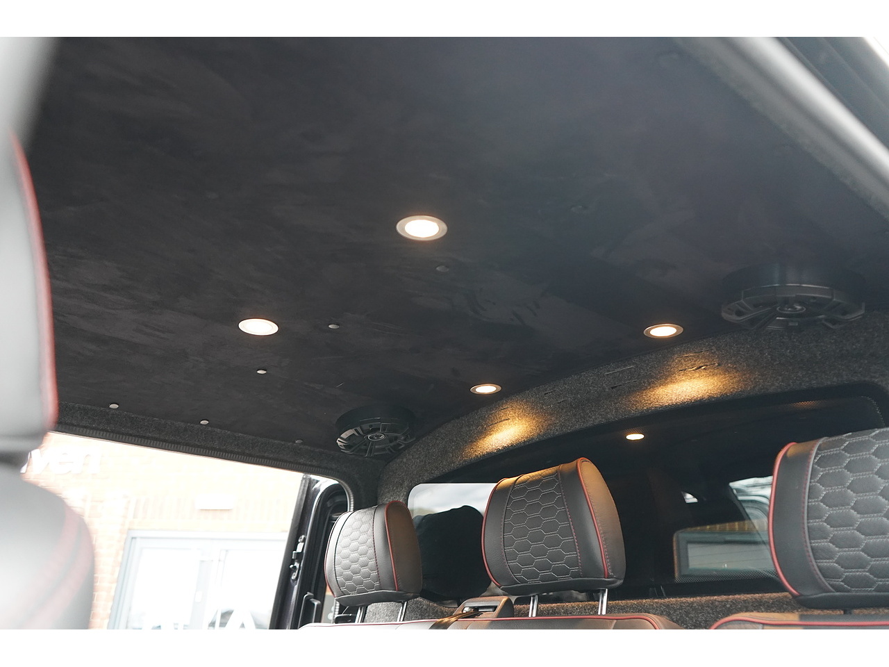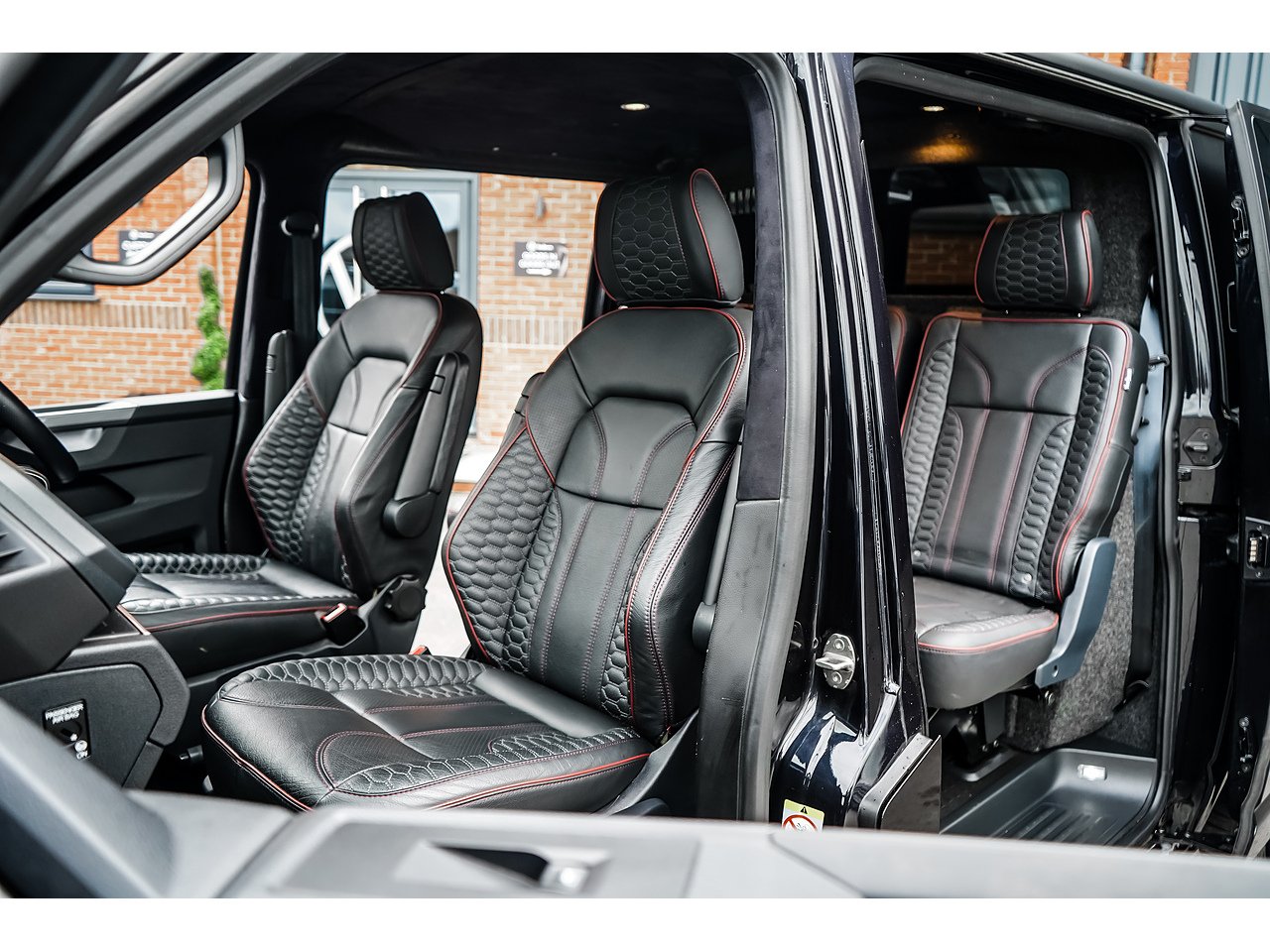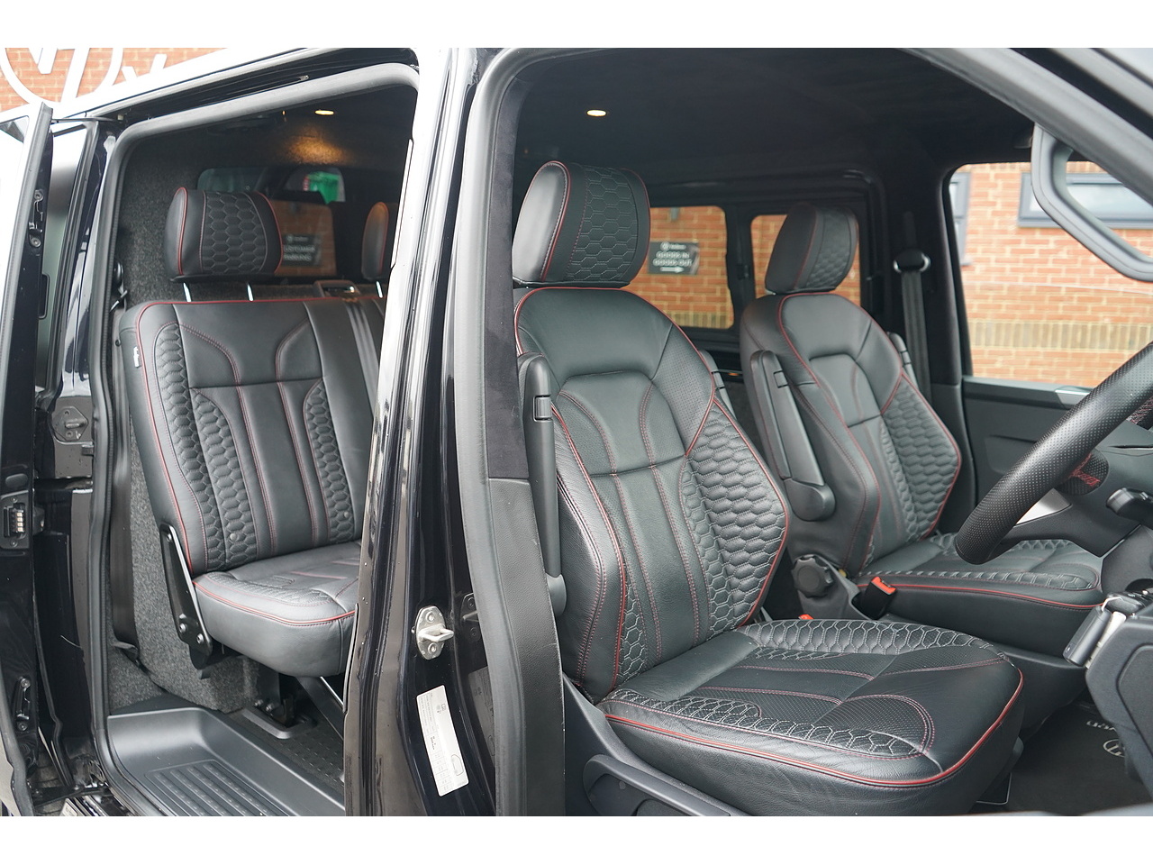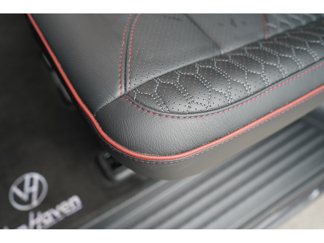 Custom VanHaven leather seating with perforations and red piping